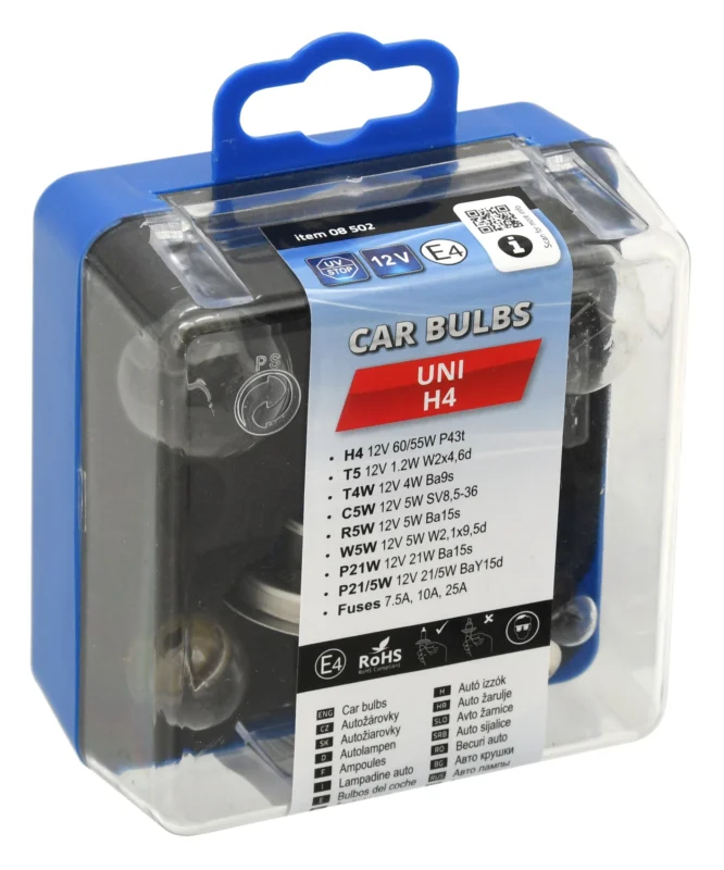 Plastová krabička náhradních autožárovek a pojistek, homologace E.