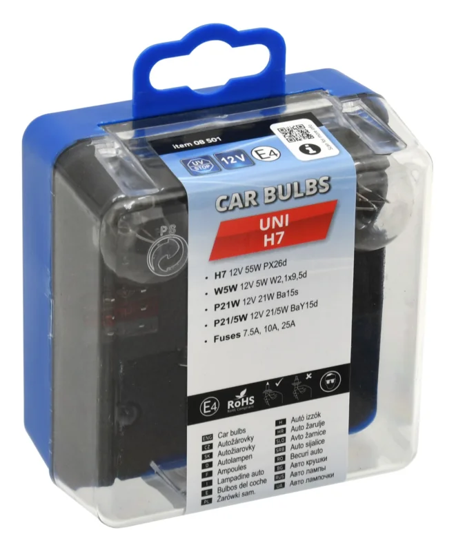 Plastová krabička náhradních autožárovek a pojistek, homologace E.