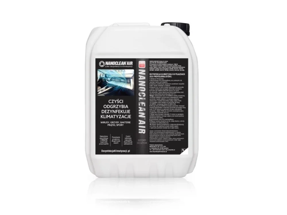 Dezinfekční a odhoubňující tekutina Nanoclean Air o objemu 5 l s vůní citrusu je připravena k okamžitému použití. Slouží k čištění, osvěžení, odhoubnění a dezinfekci klimatizačních a ventilačních systémů vozidel. Lze ji používat v ultrazvukových zařízeních, jako jsou AirMaster II, Air+, Wynns či U-view.