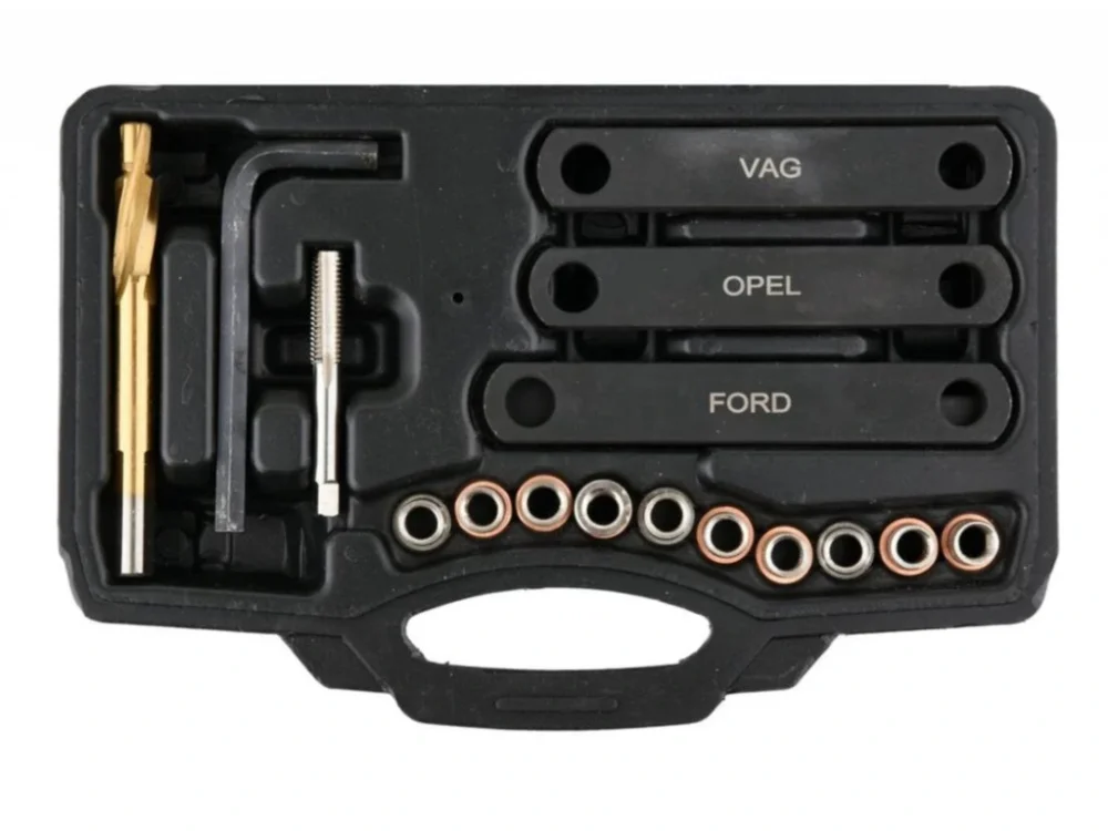 Sada na opravu závitů brzdových třmenů M9x1.25mm pro vozidla značek Opel, Ford a VAG. S touto sadou budete schopni rychle a efektivně opravit poškozené závity brzdového třmenu pomocí nových závitových vložek. 3 vodící lišty zabezpečují správné umístění vložky pro přesnou opravu. Vyrobeno z HSS materiálu. Celá sada obsahuje 16 prvků potřebných k opravě závitů, vše je přehledně uloženo v plastovém kufříku.