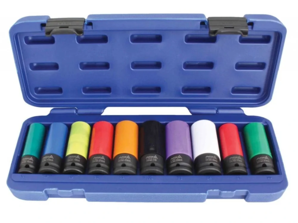 Nástrčné klíče pro hliníkové disky 10 ks, s uchycením 1/2 a rozměry 15, 2x 17, 19, 2x 21, 22, 23, 24 mm. Určeno k montáži nebo demontáži kola. Klíče jsou vybaveny plastovým ochranným pouzdrem, které zabraňuje poškození nebo poškrábání hliníkového disku. Klíče jsou uloženy v praktické krabičce, která je vyrobena z plastu pro bezpečné uložení. Ideální pro dílny a autoservisy.