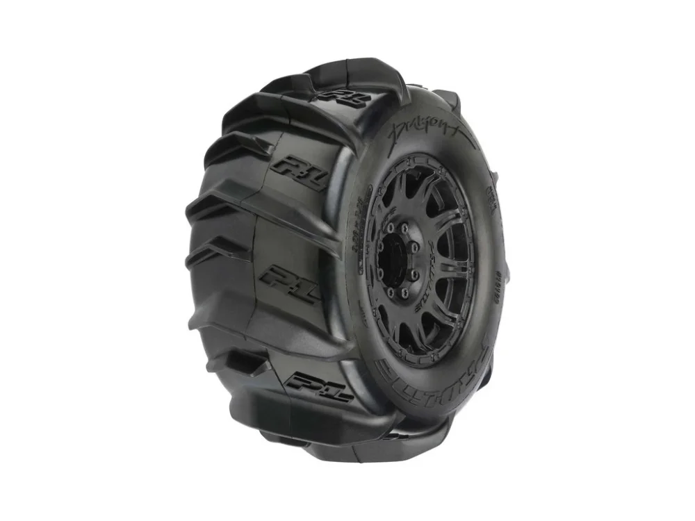 Kompletní kola Pro-Line pro RC modely aut 1:8. Rozměr \\u2300184x83 mm. Disk Raid má černou barvu. Pádlové pneumatiky Dumont 3.8\\“ MT, tvrdost směsi Z3 (střední). Unašeč je šestihran 17 mm.