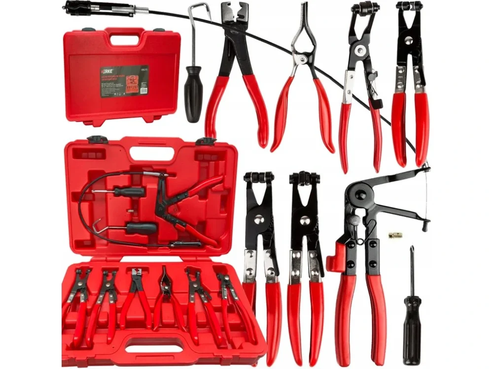 Profesionální sada kleští na hadicové spony určená k snadnému a bezpečnému sejmutí i upevnění různých typů pružných, plastových a kovových spon. Díky speciální konstrukci umožňují přístup i do těžko dostupných míst. Každý typ kleští je navržen tak, aby usnadnil práci s různými druhy spon a zajistil jejich pevné uchopení.