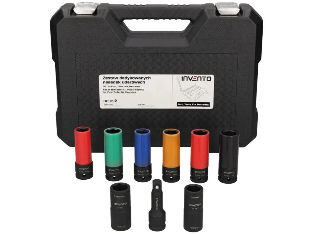 Profesionální sada rázových hlavic INVENTO 1/2\\“ je určena pro bezpečnou a přesnou práci s hliníkovými disky vybavenými nestandardními šrouby a maticemi kol, používanými u vybraných značek osobních vozidel, jako jsou Ford, Tesla, Kia, Hyundai a Mercedes.