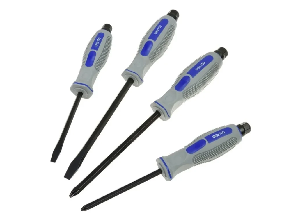 Sada obsahuje čtyři šroubováky určené pro těžkou práci, vyrobené z vysoce kvalitní chrom-vanadiové oceli (CrV). Díky průchozímu dříku, který prochází celou rukojetí a je zakončen kovovou hlavicí se šestihranným úchytem, lze šroubováky používat s klíčem nebo kladivem.