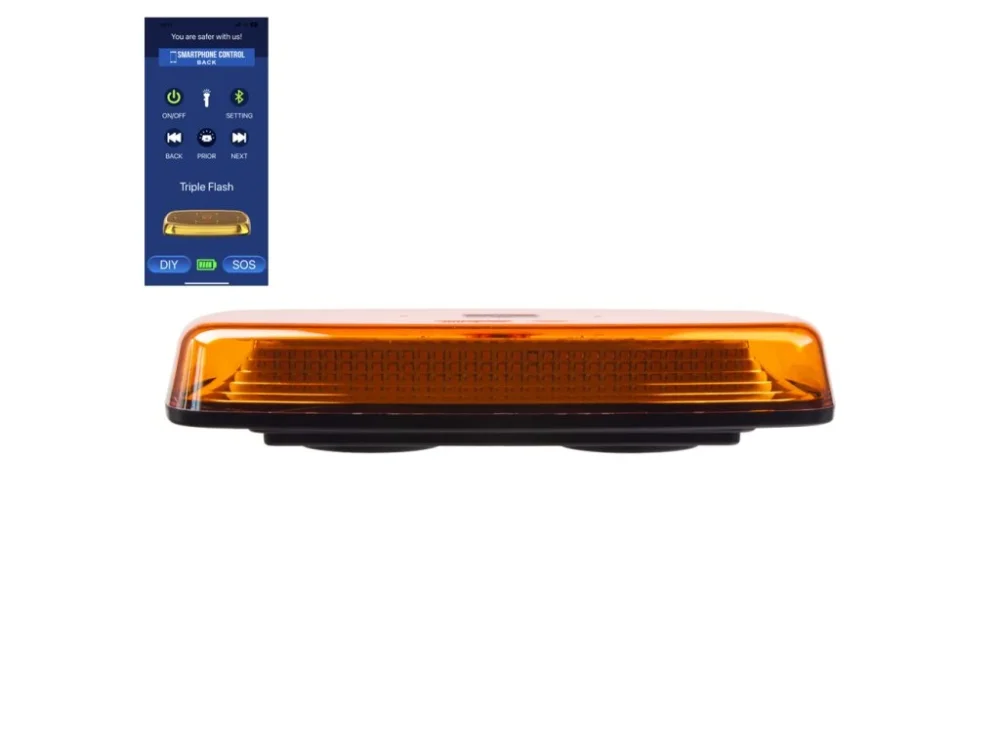 Akumulátorová nabíjecí mini výstražná rampa s LED technologií a zábleskovým režimem s možností ovládání pomocí dálkového ovladače nebo aplikace Bluetooth APP pro iPhone / Android.