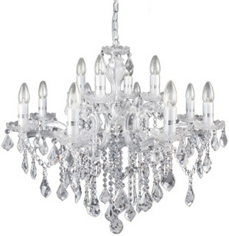 Stylový křišťálový závěsný lustr FLORIAN SP12 z kolekce interiérového osvětlení Ideal Lux ve větším provedení o průměru 72 cm zazáří v jakémkoli interiéru, jeho design vynikne především v prostoru s vysokým stropem. Kovový rám s rameny ve stříbrné barvě kombinovaný s čirým sklem je ozdoben křišťálovými přívěsky ve tvaru osmiúhelníků a kapek. Závěsný řetěz je potažen šedým sametem a délku jeho zavěšení lze libovolně nastavit při instalaci podle potřeby od 87 cm do 120 cm. Lustr je osazen paticemi E14 o maximálním příkonu 12 x 40 W. ?árovky nejsou součástí balení, pro úsporu elektrické energie doporučujeme použít LED světelné zdroje ve tvaru svíčky (typ B35 a BA35). Krytí IP20 je vhodné pro použití do interiéru.