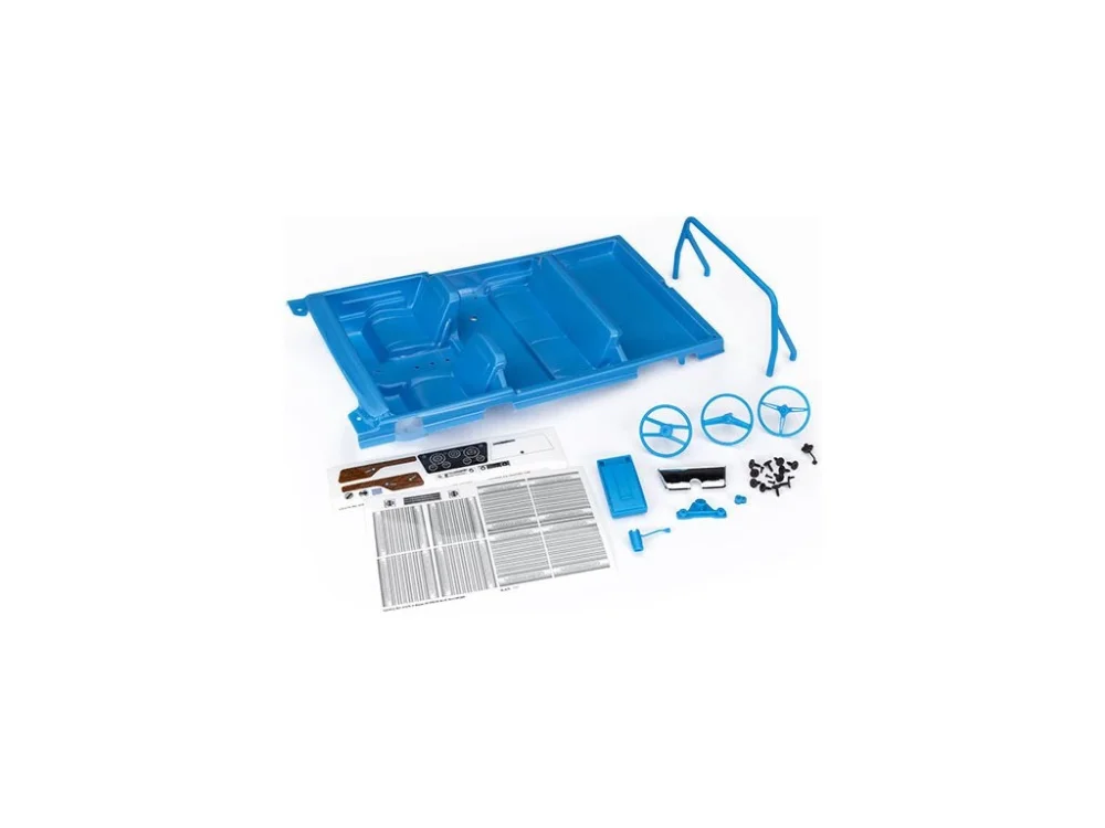 Traxxas interiér modrý pro karoserie TRX-4 Chevrolet Blazer 1969-1972 s bezsponkovým systémem upínáním. Balení obsahuje vanu interiéru, maketové doplňky (ochranný rám, přístrojový panel, volanty, řadicí páku a středový panel), detailní samolepky.