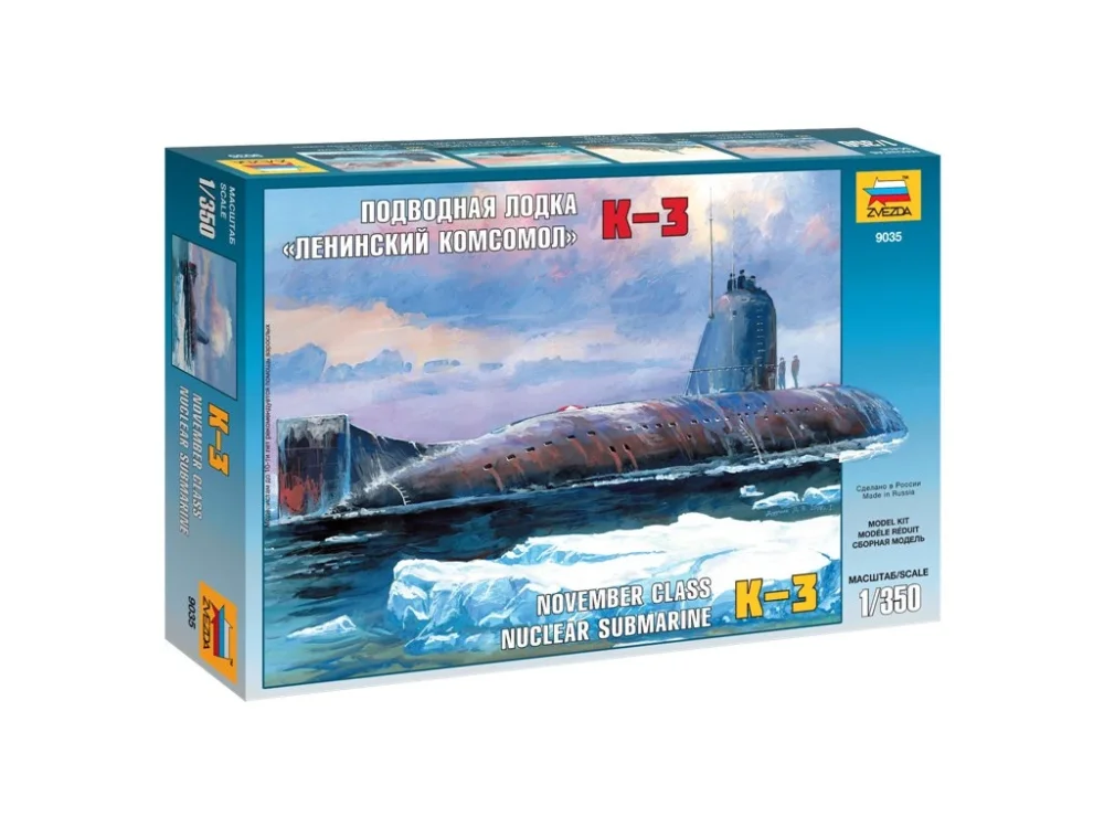 Plastikový model Zvezda 9035 – ruská jaderná ponorka K-3 Leninskij Komsomol. Měřítko 1:350, délka 30,5 cm. Stavebnice obsahuje 34 dílků ke slepení.