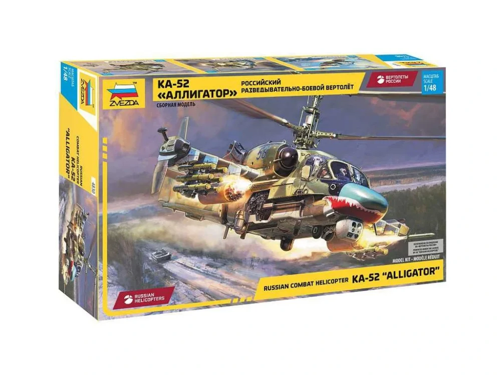 Plastikový model Zvezda 4830 sovětského bitevního vrtulníku Kamov Ka-52 ke slepení. Měřítko 1:48, délka 33,3 cm. Stavebnice obsahuje 385 dílků ke slepení.