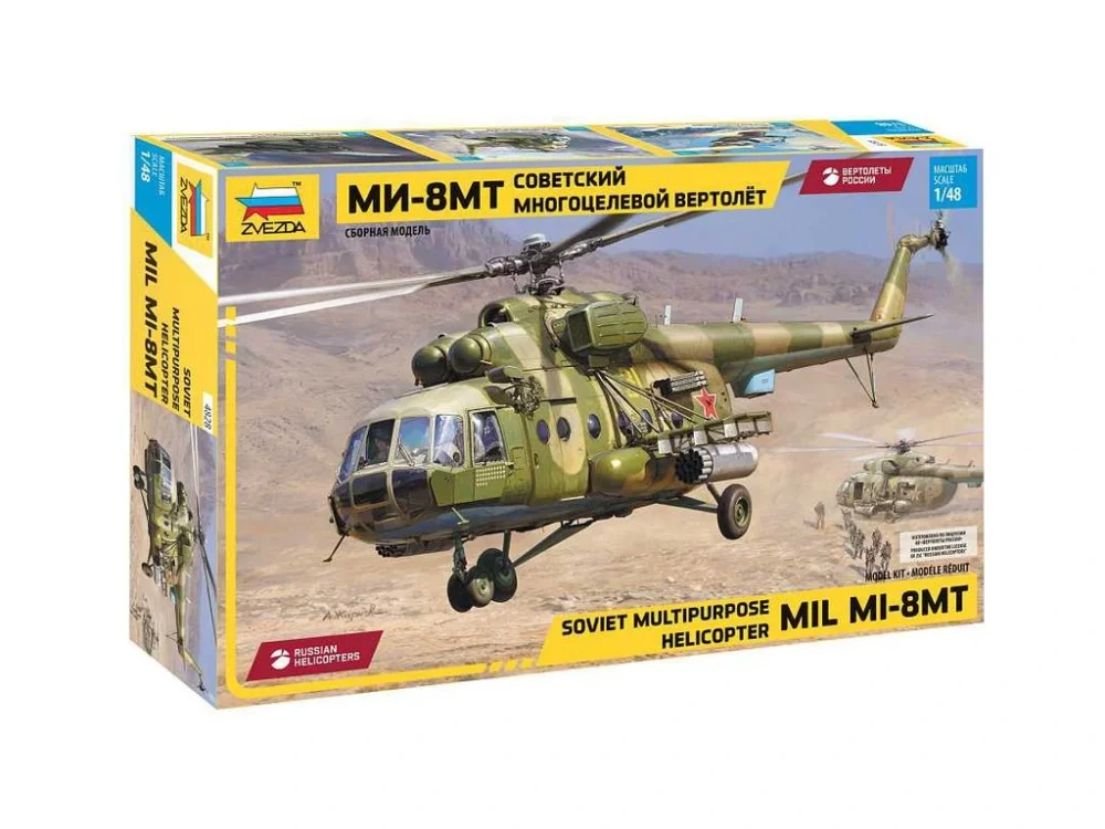 Plastikový model Zvezda 4828 – víceúčelový útočný vrtulník MIL Mi-8MT v měřítku 1:48 ke slepení. Stavebnice obsahuje 354 dílků, délka 527 mm.